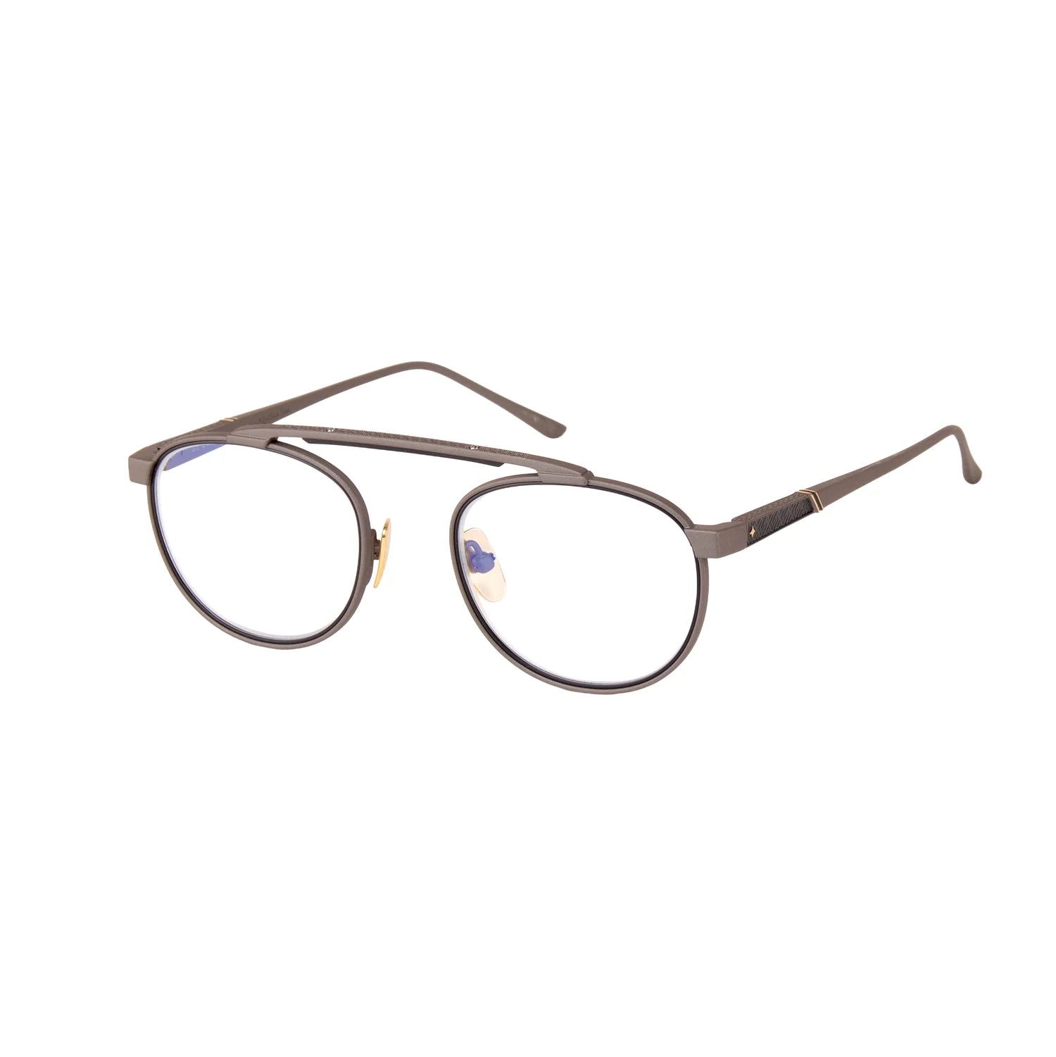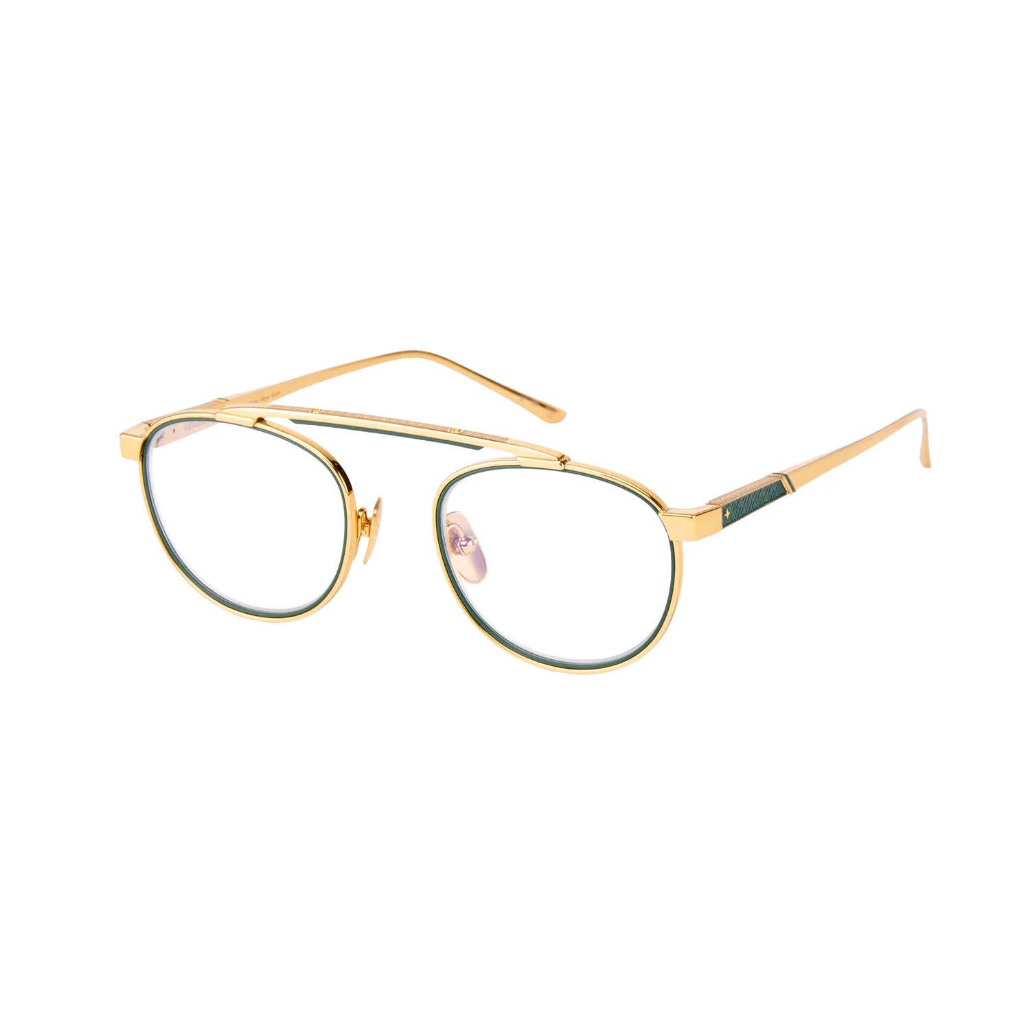 Inspired by Friedrich Geiger, a master of automobile design and precision form, Geiger embodies modern minimalism in its purest expression. The bridge-less round silhouette is crafted from 100% gold-plated titanium and accented with hand-enameled rim and crossbar insets — a study in the tension between structure and fluidity. Its architectural balance evokes the enduring artistry of mechanical design reimagined through the lens of fine eyewear.