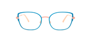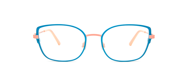 TGG: The Sally 20 frame is a vibrant, lightweight design with a softly geometric silhouette, blending rounded and angular elements. Its bold sky-blue front is accented by delicate peachy-pink temples and bridge, creating a playful yet sophisticated color contrast. The thin metal construction keeps it airy and comfortable, ideal for all-day wear. This frame is great for someone who loves color and personality in their eyewear without sacrificing elegance or wearability.
